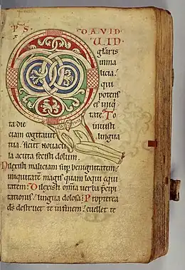 This psalm opens the second section of the three traditional divisions of the Latin psalter, and for this reason the first words (Quid gloriatur in malitia qui potens est iniquitate...), and above all the initial "Q", were often greatly enlarged in illuminated manuscript psalters, following the pattern of the Beatus initials at the start of Psalm 1, and the "D" of Psalm 102.[7]
