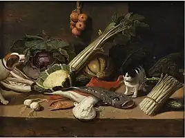 - ↑ Pseudo-Jan van Kessel II, Still life with fish, vegetables, flowers and two cats, auctioned at Hampel Kunstauktionen (München) on 24 September 2015, description at the Netherlands Institute for Art History site
