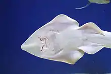 The shovelnose guitarfish, Pseudobatos productus, is a ray in the family Rhinobatidae.[2][3] It becomes mature at an estimated seven to eight years old. Males are between 90–100 cm (35–39 in) long, while females are around 99 cm (39 in) at that age.[4] The ray can live up to 11 years, and full-grown sizes are around 120 cm (47 in) for males, and females reach 137 cm (54 in).[5] They range from central California south to the Gulf of California.[1] Morphological and genetic variations occur in the mitochondrial DNA in those found in the Gulf of California, evidencing their isolation from the rest. Because of this, the conservation of this species must be carefully managed to preserve the biological diversity.[6] The shovelnose is considered to be a primitively developed ray, with many features of both sharks and rays.