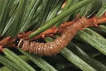 The larvae feed on Abies alba and Picea abies species. They mine the needles of their host plant. Current year's needles are mined out from a silken tube attached to a twig. Most frass is ejected into the tube. Older larvae vacate the mine and live freely, feeding among spun needles.[4] The larvae are brownish with a shining black head. The species overwinters in the larval stage.