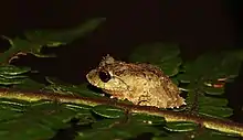 Pseudophilautus dilmah, the Dilmah shrub frog, is a species of frogs in the family Rhacophoridae, endemic to Sri Lanka.[1] The species was discovered and documented in 2015 by Sri Lankan prominent wildlife researcher and herpetologist Mendis Wickramasinghe and his crew from Loolkandura forest of Central highlands of Sri Lanka, 1324 meters above sea level.[2] It is distinguished mainly from other shrub frogs by the absence of nuptial pads and anterior and posterior dorsum without horny spinules.[3] [4]