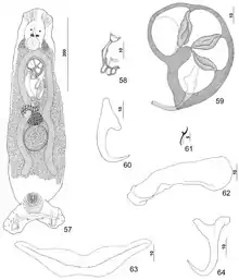 Pseudorhabdosynochus firmicoleatus is a small monogenean, 400-500 µm in length.[1] The species has the general characteristics of other species of Pseudorhabdosynochus, with a flat body and a posterior haptor, which is the organ by which the monogenean attaches itself to the gill of is host. The haptor bears two squamodiscs, one ventral and one dorsal. The sclerotized male copulatory organ, or "quadriloculate organ", has the shape of a bean with four internal chambers, as in other species of Pseudorhabdosynochus.[2] The vagina includes a sclerotized part, which is a complex structure.