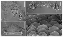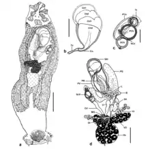 The sclerotized male copulatory organ, or "quadriloculate organ", has the shape of a bean with four internal chambers, as in other species of Pseudorhabdosynochus.[2] The vagina includes a sclerotized part, which is a complex structure.