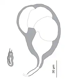 The sclerotized male copulatory organ, or "quadriloculate organ", has the shape of a bean with four internal chambers, as in other species of Pseudorhabdosynochus.[2] The vagina includes a sclerotized part, which is a complex structure, 26-35 µm in length. It exhibits a trumpet in continuity with the primary canal, a straight primary canal, and primary and secondary chambers included in a common sclerotised mass along the primary canal. The sclerotised vagina is the structure used by systematicians to differentiate species of Pseudorhabdosynochus. The closest relatives of P. regius, based on the structure of its sclerotised vagina, are species mostly found in the Mediterranean Sea and parasites on species of Mycteroperca.[1]