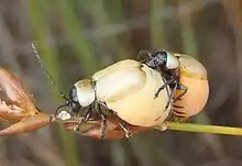 Pseudorupilia ruficollis aka as the Swollen Restio Beetle is a member of the Chrysomelidae family. Pseudorupilia (Jacoby, 1893) resembles the Australian genus Rupilia (Clark, 1864) whence its generic name. It is known only from South Africa and is strongly associated with the Cape fynbos, feeding on the pollen of Restionaceae, Proteaceae and Asteraceae.[1]