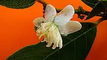 This plant can be a shrub 1 to 3 meters tall or a tree reaching 7 meters. The bark and foliage are grayish. The leaves are up to 14 centimeters long by 8 wide. The stiff, oval-shaped blades sometimes have toothed edges. The undersides are very glandular and are coated in pale or reddish hairs. Flowers grow in the leaf axils, singly or in clusters of up to 3. The flower has a white corolla and many stamens.[2] It is fragrant.[5] The fruit is firm, rounded, and up to 2.5 centimeters wide. It has a yellow skin, a yellow outer pulp and whitish inner pulp containing many seeds.[2]