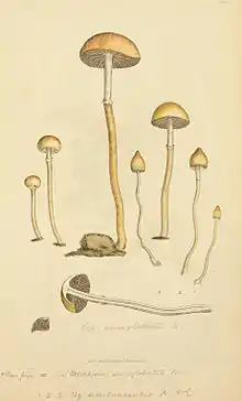 The first reliably documented report of Psilocybe semilanceata intoxication involved a British family in 1799, who prepared a meal with mushrooms they had picked in London's Green Park. According to the chemist Augustus Everard Brande, the father and his four children experienced typical symptoms associated with ingestion, including pupil dilation, spontaneous laughter and delirium.[52] The identification of the species responsible was made possible by James Sowerby's 1803 book Coloured Figures of English Fungi or Mushrooms,[53] which included a description of the fungus, then known as Agaricus glutinosus (originally described by Moses Ashley Curtis in 1780). According to German mycologist Jochen Gartz, the description of the species is "fully compatible with current knowledge about Psilocybe semilanceata."[54]