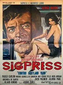 Psychopath (Italian: Sigpress contro Scotland Yard, German: Mister Zehn Prozent - Miezen und Moneten) is a 1968 film directed by Guido Zurli.[1] The film is about Sigpress (Francisco Martinez Celeiro), a thief who steals jewels which he then returns to the owners in order to collect money as a reward. He is being tracked by Scotland Yard when he learns that the gem called the Eye of Allah is being escorted from London to Paris. On attempting to steal the jewel, he finds it's a fake which leads to his own investigation.