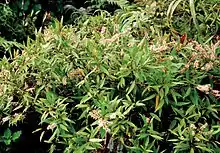 - Pterophylla marquesana var. myrsinites (Fosberg & Sachet) Pillon & H.C.Hopkins – found only on Hiva Oa, where it generally grows as a shrub 0.6 to 1.5 m high, and less often as a small tree up to 2 m high. Its flowers are white, its young fruits are red, and its inflorescences are much shorter than those of var. marquesana. It is common in summit scrub (maquis sommital) on high, windswept slopes and ridges on the dry side of island, and in cloud forest on the windward side of the island, from 800 to 1300 metres elevation.[3]