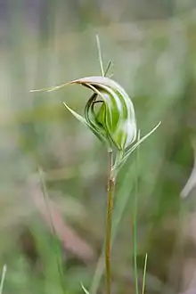 Pterostylis aestiva, commonly known as the long-tongued summer greenhood,[2] is a species of orchid endemic to south-eastern Australia. As with similar greenhoods, the flowering plants differ from those which are not flowering. The non-flowering plants have a rosette of leaves flat on the ground but the flowering plants have a single flower with leaves on the flowering spike.