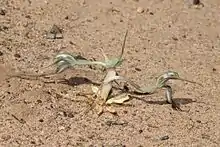 Pterostylis despectans, is a terrestrial, perennial, deciduous, herb with an underground tuber. It has a rosette of between six and ten leaves at the base of the flowering spike, each leaf 10–20 mm (0.4–0.8 in) long and 6–8 mm (0.2–0.3 in) wide. The leaves are often withered by the time of flowering. Up to six translucent flowers with green and brown markings and 30–38 mm (1.2–1.5 in) long, 6–8 mm (0.2–0.3 in) wide are borne on a flowering spike 30–50 mm (1–2 in) tall. Each flower is carried on the end of a long, thin stalk. Three or four papery bracts are wrapped around the flowering spike. The dorsal sepal and petals are joined to form a hood called the "galea" over the column with the dorsal sepal having a thread-like tip 10–13 mm (0.4–0.5 in) long. The lateral sepals are slightly wider than the galea and often touch the ground. They are shallowly dished, densely hairy on their outer edges and suddenly taper to a thread-like tip, 20–26 mm (0.8–1 in). The labellum is brown to green, thin and insect-like, about 5 mm (0.2 in) long and 2 mm (0.08 in) wide. The "head" end has two long bristles and there are up to 10 to 16 shorter bristles on the side. Flowering occurs from November to December.[2][3][4][5]