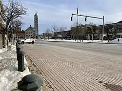 On May 13, 1849, a fire started inside the American Hotel, killing one. Most of Public Square and buildings on three adjacent streets were destroyed.[4] The fire destroyed nearly all of the business portion of the city, including three banks, post office, three printing offices, two hotels, and thirty stores.[5] The square was immediately rebuilt for $250,000 (Now $8,794,000).[6] Several buildings erected during the rebuilding still stand. In the rebuilding of the 1850s, the city created three parks at the square's center, with a fountain inside the center park. During Watertown's industrial boom in the late 19th and early 20th centuries, Public Square became the heart of Watertown's retail, business and social life. In the 1950s, the three parks in the square's center were combined into one large park.