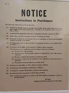 Liquor Control Board of Ontario (LCBO) notice outlining the rules for purchase and consumption of alcoholic beverages.