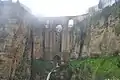The construction of the newest bridge (the one standing as of 2017) was started in 1759 and took 34 years.[1] There is a chamber above the central arch that was used for a variety of purposes, including as a prison. During the 1936–1939 civil war both sides allegedly used the prison as a torture chamber for captured opponents, killing some by throwing them from the windows to the rocks at the bottom of the El Tajo gorge.[2] The chamber is entered through a square building that was once the guard-house. It now contains an exhibition describing the bridge's history and construction.