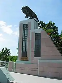 An 1818 map[lower-alpha 1] of the city of Ponce recorded by historian Eduardo Neumann Gandia shows that the site currently occupied by Puente de los Leones was a regular cross-way over Rio Portugués between the eastern flatlands and the village of Ponce to the west.[8] The first permanent bridge was designed and built in 1900 with funds of the Ponce Municipal Government.[9][lower-alpha 2] An 1899 map titled "Ponce Harbor Porto Rico, Map No. 911", by Otto Hilgard Tittmann (b.1850 - d.1938) of the U.S. Coast and Geodetic Survey and published by Julius Bien & Co Photo Lithographers, New York, New York, shows a bridge over Río Portugués at the road from Ponce to Guayama via Calle Cristina, namely today's (2018) Puerto Rico Highway 1.[10] In 1950, it was named "Puente Blas Silva" (Blas Silva Bridge) in honor of the outstanding architect from Hormigueros who lived most of his adult life in Ponce and designed many structures in the city.[11] The bridge was rebuilt in 1990,[12] and reopened in 1992[13] at which point it was renamed Puente de los Leones as part of the festivities of the 300th anniversary of the founding of the city.[14][15]