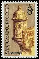 San Juan, Puerto Rico was commemorated with an 8-cent stamp on its 450th anniversary issued September 12, 1971. The vignette pictures a sentry box from Castillo San Felipe del Morro. San Juan was founded in 1519, and fortress construction began in 1539.[7]