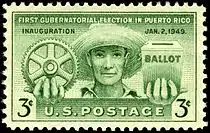 The first free election for governor of the US territory of Puerto Rico was honored with a 3-cent stamp on April 27, 1949, at San Juan, Puerto Rico. Prior to January 2, 1949, the US president appointed Puerto Rico's governors. The stamp's shows a rural Puerto Rican holding a cogwheel for industry and a box representing the election. The stamp was inspired by a sketch prepared by Irene Delano of the Office of the Governor of Puerto Rico. 'Inauguration' refers to the election of Luis Muñoz Marín, the first democratically elected governor of Puerto Rico. The United States issued a 5-cent definitive stamp in Muñoz Marin's honor on February 18, 1990.[6]