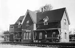 It is built of brick and is described as "restrained gothic style, two stories, cross gable roof with 6 hip gable dormers and decorative faces".[2] The railway station was listed on September 11, 1996, as a Municipally Registered Property under the Heritage Property Act, and as a Provincially Registered Property under the same statute in 2009.[4][7][5] The Pugwash railway station is one of only two stations designed by Fleming still standing in Nova Scotia.[8] The station is also famous for its part in the Thinkers Conference. Pugwash native Cyrus Eaton used the station to transport and house those who attended conference.[9]