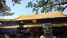 Yuantong Hall (圆通宝殿) is the main hall to enshrine Guanyin. It was built in 1214 during the Southern Song dynasty and rebuilt in 1693 during the reign of Kangxi Emperor of the Qing dynasty. The hall is 18-metre (59 ft) high, 42-metre (138 ft) wide and 24-metre (79 ft) deep. It is single-layer and double-eave wooden structure and covered with yellow glazed tiles on the roof with solemn and elegant cornices. A 8.8-metre (29 ft) statue of Guanyin is enshrined in the hall. He wears heavenly crown which has a statue of Amitabha posing in mudras on it. On the two sides of the hall sit 32 statues of Guanyin, representing his various appearances in the world.[4][6]