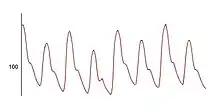 | Pulse pressure waveform displaying the variation in pressure between beats in pulsus alternans. | |