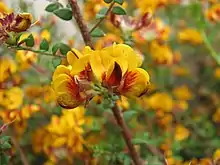 Pultenaea gunnii, commonly known as golden bush-pea,[2] is a species of flowering plant in the family Fabaceae and is endemic to south-eastern Australia. It is a slender, erect to spreading shrub with hairy young stems, egg-shaped to lance-shaped leaves with lance-shaped stipules at the base, and bright yellow and dark red flowers.