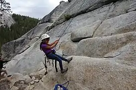 Some good beginner routes are on the easier low angled face, and several harder routes are around the far side of the dome; there is an overhanging face.[5]