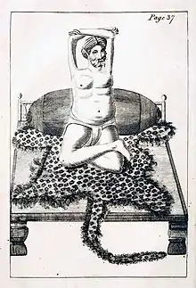 Puran Puri's image with his hands raised in penance, along with the image of a fellow sanyasi Param Swatantra Prakashanand Bramhachari lying on a bed of nails, was drawn by Jonathan Duncan himself[7] for his 1799 article in the 'Asiatic Researches' journal. These were among the earliest images of yogis received in Europe, and triggered the European fascination for documentation of the novel postures and painful practices of ascetics.[8] As such, the image of Puran Puri was widely redrawn and reproduced as an archetype of a yogi or gymnosophist.[9]