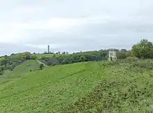The grassy slopes of Purdown. This part is Stoke Park. The Purdown BT Tower and an obelisk base commemorating a death are visible.
