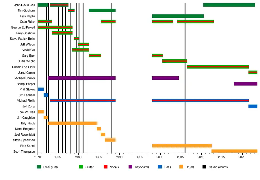 • John David Call — pedal steel guitar, banjo, dobro (1970–1972, 1973–1977, 2010–present; guest 2006–2007)