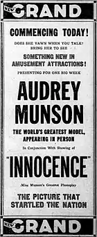 Isolated newspaper advertisements of 1921 and 1922 describe another Munson film called Innocence. It was during a showing of Innocence combined with a personal onstage appearance by Munson that caused her arrest in St. Louis on October 3, 1921 at the Royal Theater (later the Towne Theater) on an indecency charge.[11] Her manager was also arrested. Both were acquitted and were still appearing in St. Louis weeks later, enacting "a series of new poses from famous paintings".[12]