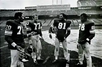 Marshall said that the players disliked the name "Purple People Eaters" and called themselves "The Purple Gang", but "we've got to ride with it because it's our handle".[7] The group was a major factor in the post-season success of the Vikings from the late 1960s through the 1970s.[8] The Purple People Eaters were one of the most identifiable front fours in National Football League history, with the "Fearsome Foursome" of the Los Angeles Rams during the 1960s and early 1970s, the "Steel Curtain" of the Pittsburgh Steelers during the 1970s, the "New York Sack Exchange" of the New York Jets during the 1980s, and the 1985 Chicago Bears "Monsters of the Midway".