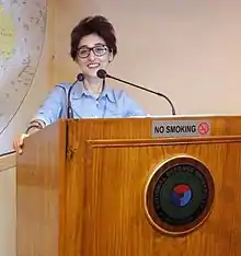 Chaudhary is currently Member Board of Advisors for CIME[18] and a Mentor for UN-Habitat Youth Fund Program.[19] She continues to train and mentor journalists all across Pakistan on values and ethics.[20][21][22][23][24][25] Chaudhary is an alumnus of the National Defence University[26] and serves as a Committee Member on Media and Outreach. She is recognized as a Global Shaper by the World Economic Forum, as well as an ASPEN alumni,[27] and a member of the World Futures Society. Chaudhary is on the Planning Committee of the Millennium-Project (Global Futures Studies and Research) representing the Pakistan Chair.[28][29]