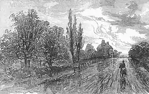 The first significant building in Putney Vale was the Halfway House, later the Bald Faced Stag, an Inn established about 1650 on the corner of Stags lane and the Portsmouth Road (now the A3).[3] In the eighteenth century the road here was a well-known spot for robbers. The inn was reputedly a haunt of the highwayman Jerry Abershawe until his execution in 1795,[11] after which his body was displayed in a gibbet at Putney Vale.[10]