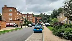 Most of the housing is provided by an estate built in the mid-1950s, on land originally earmarked for a possible cemetery extension.[3] It consists of local authority-built (mainly duplex, four-storey) maisonettes and short terraces. Many homes are now privately owned, with the balance owned and let by the Borough. The estate's curved access road, Stag Lane, has a row of shops.