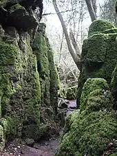 The geological features on show at Puzzlewood are known as scowles. Scowles originated through the erosion of natural cave systems formed in the Carboniferous Limestone many millions of years ago. Uplift and erosion caused the cave system to become exposed at the surface. This was then exploited by Iron Age settlers through to Roman times for the extraction of iron ore. It is usually impossible to date open-cast extraction precisely, although ores with a chemical signature consistent with those from the Forest of Dean were certainly used to make tools and weapons in the late prehistoric period.[4]