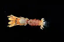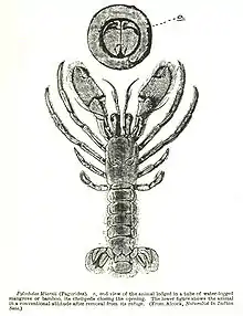 Unlike other hermit crabs, pylochelid hermit crabs are not markedly asymmetrical, with a straight body and equal numbers of appendages on both sides. This characteristic, together with the partial calcification of the abdomen (which is soft in other hermit crabs) led Edward J. Miers, when describing the first species, to consider it to represent a transition between hermit crabs and "Macrura" (long-tailed decapods, such as lobsters and shrimp).[5] Correspondingly, pylochelid hermit crabs do not usually inhabit gastropod shells, but instead withdraw into decayed pieces of wood, stones, tusk shells (especially Dentaliidae),[6] living sponges,[3] pieces of bamboo or mangroves.[6] Their claws are often adapted to form an operculum, which closes off the entrance to their home.[6]