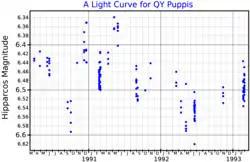 QY Puppis has been classified in the General Catalogue of Variable Stars as a semiregular variable star of type SRD.[3] QY Puppis has a temperature of 4,251 K,[8] and has expanded to a radius of 515 R☉.[7] It is approximately 60 million years old, with a mass of 6.2 M☉.[6]