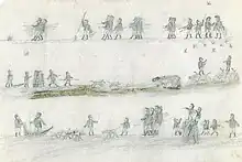 Upon boarding the Assistance, Qalaherriaq was washed and dressed in European clothing. He was given the name Erasmus York, although continued to be called variations of his birth name while aboard. He was seen as a curiosity and "the life of the party" by the crew, who recruited him to participate in the "Royal Arctic Theatre", a trope of theatrical performances. Ommanney described him as "an interesting specimen of uncivilised life."[15][16] He was the subject of a satirical article published in the Northern Lights, a ship newspaper published aboard the Assistance, where the Inuk is depicted as praising European civilization, while making various naïve and childlike statements about ship life, including a joke about him misidentifying sailors cross-dressing during a masquerade as shamanic spirits.[17][18] While on board the Assistance, Qalaherriaq drew several detailed maps of the surrounding fjords.[19]