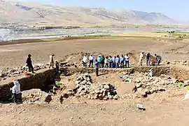 The size of the city and its structure are relatively well known due to magnometric surveys. The ruins are spread over a hill, which the excavators call the citadel, and the city proper to the north, known as the lower city. Small areas have been excavated in various places in the city. The residential buildings are made of rubble, but so far no house has been completely exposed. One building that may have belonged to a wealthy citizen of the city had a large hall, the floor of which is paved with bricks. Three phases could be distinguished. Remains of a wall were found below the house, suggesting older buildings. This was followed by the phase in which the house was built, and there are later graves that are spread over the excavation area.[4] The graves mainly contained jewelry as gifts, but there was also a well-preserved bronze bowl.[5]