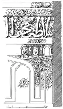 The interiors contained elaborate decorations and pointed arches that were covered in arabesque designs and vegetal and animal motifs.[11][12] These included depictions of birds (spread-winged eagles) and snakes, which may have reflected Christian influence in the region or which may have signaled that the large interior courtyards were used for secular gatherings and not for devotional use.[13] The presence of animal depictions suggest the space was not used for prayer. The interior arches are pointed or trilobed, with the spaces between the arches filled with floral detailing, creating intricate friezes. The facades also contain repeating geometric patterns with Arabic calligraphy. The presence of the naskhi (as opposed to kufic) style of Arabic script, according to the British archaeologist and scholar of Islamic architecture, Dorothy Lamb, may have reflected recent Central Asian influences.[14]