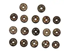 Lead cash coins (traditional Chinese: 鉛錢; simplified Chinese: 铅钱; pinyin: qiān qián; Vietnamese: Duyên tiền;[lower-alpha 1] Japanese: 鉛銭 (なまりせん); Rōmaji: Namarisen) are a type of Chinese, Japanese, and Vietnamese cash coin that were produced at various times during the monetary history of imperial China, Japan, and Vietnam. Typically cash coins produced in China between 300 BC and 1505 AD were made of bronze and those produced after 1505 AD were made of brass.[1] But, like with iron cash coins, at times when copper was scarce government authorities would produce lead cash coins to supplement the money supply and maintain market liquidity.