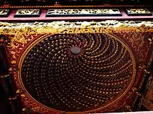 The museum preserves a thousand red wood carvings and a few hundred stone and brick carvings.[16] The 14 tile carvings over the entrance include Twin Dragons Playing with a Pearl, the Eight Immortals Crossing the Sea, "Dragon Tongue Squad", Fishing, Wood-cutting, Farming, and Reading.[2] The beams of the front stage mostly depict stories from the Romance of the Three Kingdoms, including Three Heroes Fighting against Lu Bu and the Empty Fort Strategy. It also includes some carvings of actors and auspicious designs such as Magpies Perching on Plum Trees, dragons, phoenixes, and peonies. The screens are engraved with paintings of six ladies. Curved rails ("Rails for Beauties to Lean On") line three sides of the stage.[2]
