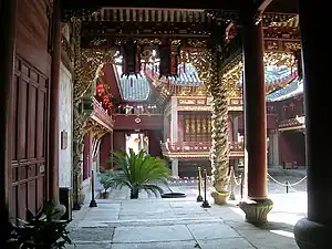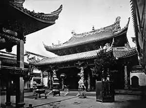 After it was rebuilt by Fujianese merchants in the mid-19th century, it became known as the Fujianese Guildhall,[6] the Qing'an Guildhall,[1] or Qing'an Assembly Hall.[7] The merchants' involvement in northern maritime (北洋) trade led local Chinese to refer to it as the North Guildhall.[2] In English, it was called the Fukien[10] or Fujian Temple,[1] Fukien Guildhall,[5] Fokien Guild House[8] or Guildhouse,[11] the Guild House of Fokien Merchants,[6] and the Guildhall for the Fujian People or Fukien Hui Kuan.[12]