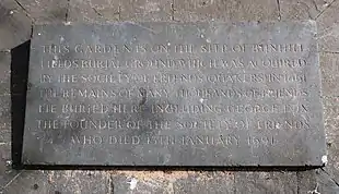 Graves were not individually marked with monuments or gravestones. The sole exception was a small tablet on the wall, simply inscribed "G. F.", in commemoration of George Fox (1624–1691), one of the founders of the movement. However, so many Quakers came to visit this that it was denounced as "Nehushtan" (idolatrous) by Robert Howard, a prominent member of the Society, and was destroyed.[4] Fox is now commemorated by a more modern marker, also set against the wall.