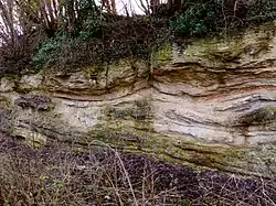 The strata of the quarry face at the western side of the Quarry Moor site are the remains of a Permian shoreline of 255 million years past. Sediments from the tropical Zechstein Sea ultimately became the Magnesian Limestone outcrop of north-east England, part of which is exposed here. Limestone has been quarried here for at least six centuries, and used for construction.[2][3] For example, in the 15th century the walls of the 12th century Chapel of St Mary Magdalen, Ripon, were refaced with blocks of limestone from Quarry Moor.[4] By the 1870s there were lime kilns on the site, making quicklime for mortar.[5]