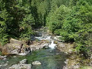 Quartzville Creek is a 28-mile (45 km) tributary of the Middle Santiam River in Linn County in the U.S. state of Oregon.[4] It is paralleled by the Quartzville Back Country Byway and used for recreation, including camping, fishing, hunting, kayaking, and gold panning.[6] The lower 12 miles (19 km) of the creek, from the Willamette National Forest boundary to Green Peter Reservoir, was designated Wild and Scenic in 1988.[7]