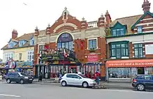 The theatre and cinema closed in 1939 with the outbreak of the Second World War, with the building being used as a canteen for troops.[3] The building suffered major damage in the storms of 1996, with the glass canopy over the entrance being destroyed and flood damage to the hall.[2] The building was restored for use as an amusement arcade and then a public house, at one time called the Mambo bar.[3] Until 2015 it operated under its original name, "The Queen's Hall," as a pub. The pub closed in 2015. The lease was sold in 2012 for an undisclosed sum. It incorporated upper and lower ground floors with the balcony set up as a VIP area. There were also a kitchen and washing up area with a manager's flat above.[5] It was refurbished and reopened in 2016.[6]