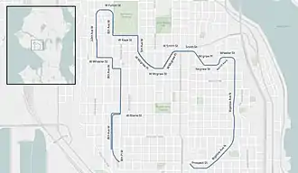 The 1907 city ordinance establishing the boulevard describes it as "extending from Prospect Street between Warren Avenue and Second Avenue North, in a northeasterly direction, to an intersection with Galer Street near Bigelow Avenue; thence northerly following the general direction of Bigelow Avenue as nearly as the contours of the ground will permit, to Wheeler Street; thence westerly to Nob Hill Avenue; thence southerly to McGraw Street; thence westerly to Second Avenue North; thence northwesterly to Smith Street, west of Warren Avenue; thence westerly along Smith Street to a point east of First Avenue West; thence southerly to McGraw Street and Second Avenue West; thence westerly to Third Avenue West; thence northwesterly to Fifth Avenue West and Smith Street; thence northerly to Ray Street; thence westerly to Eighth Avenue West; thence northerly to West Armour Street; thence northwesterly to West Fulton Street; thence westerly to Ninth Avenue West; thence southwesterly to Tenth Avenue West and West Armour Street; thence southerly to West Wheeler Street; thence easterly to Eighth Avenue West; thence southerly to McGraw Street; thence easterly to Seventh Avenue West; thence southerly to Blaine Street; thence westerly to Eighth Avenue West; thence southerly to West Lee Street; thence southeasterly to West Highland Drive and Seventh Avenue West…"[4] West Highland Drive itself completes this as a loop.[1]