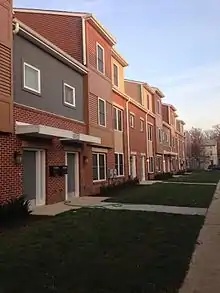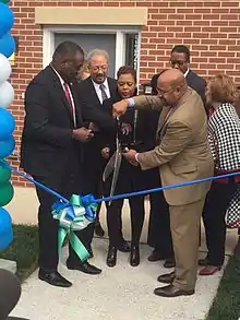 Queen Lane Apartments opened in 1955[1] as one of several Post-War public housing hi-rise complexes in Philadelphia, Pennsylvania which were built and maintained by the Philadelphia Housing Authority (PHA). The PHA demolished the Queen Lane high-rise on September 13, 2014.[2] The PHA replaced it with 55 new, affordable rental units for individuals and families.[3][4] The first of the new 55 units were opened on December 15, 2015. Mayor Michael Nutter, City Council President Darrell L. Clarke, City Councilwoman Cindy Bass, PHA President/CEO Kelvin Jeremiah, residents of the nine new units, and other dignitaries joined together to cut the ribbon.[5]