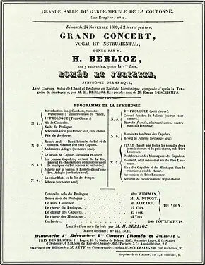 Roméo et Juliette is a symphonie dramatique, a large-scale choral symphony by French composer Hector Berlioz, which was first performed on 24 November 1839. The libretto was written by Émile Deschamps, and the completed work was assigned the catalogue numbers Op. 17 and H. 79. It is based on Shakespeare's play Romeo and Juliet; it is regarded as one of Berlioz's finest works, and it is among the most original in form.[1] The score is Berlioz's most comprehensive and detailed programmatic piece.[2]